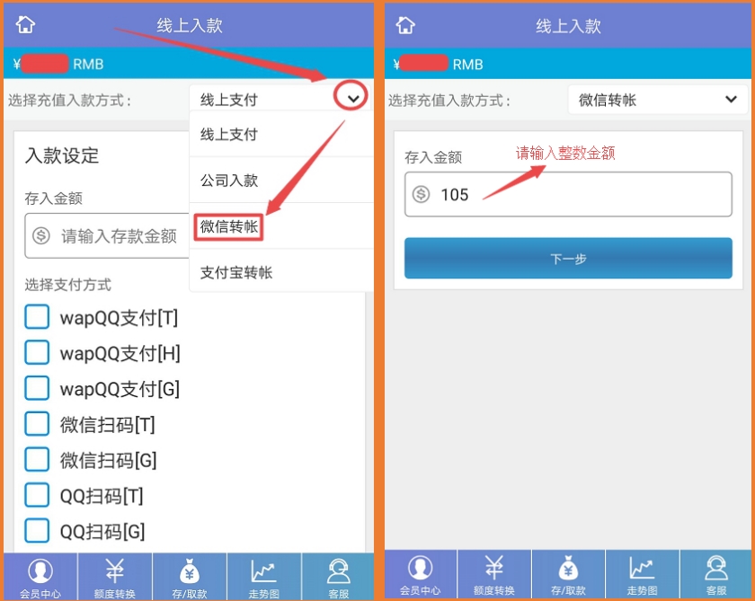 登入账号后,点击屏幕下方导航中的存/取款--存款,再点击右上角充值方式下拉菜单--选择微信转账,并填写存入金额。注:此处存入金额只支持整数,不支持小数点。