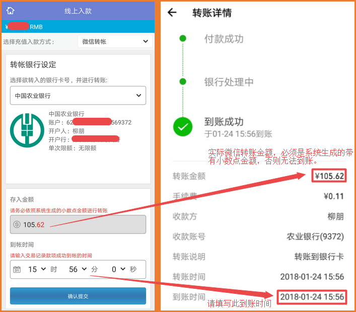 进入微信转账页面后,记录/复制好公司收款银行账户,登陆您的微信进行转账,且微信实际转账金额必须与页面显示的金额一致。转账成功后,等待转账详情--显示到账成功。按照提示填写您的到账时间,在点击确认提交。(温馨提示:使用微信转账至农业银行是即时到账的;务必先转账成功在提交,否则财务人员查询不到款项无法第一时间帮您添加额度。)